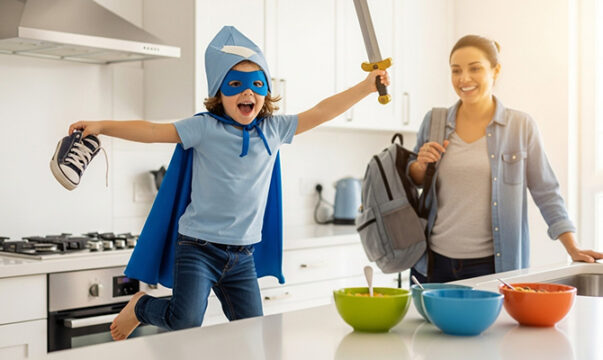 În loc de „Grăbește-te, întârziem!”, încearcă „Agent [numele copilului], ai 5 minute să-ți pui pantofii și să salvezi lumea de monstrul Întârziere! Ești gata?”. Copiii adoră să fie eroii propriei povești, iar un pic de joacă poate face minuni. Bonus: s-ar putea să te trezești și tu râzând când îl vezi alergând să-și ia haina ca un supererou.