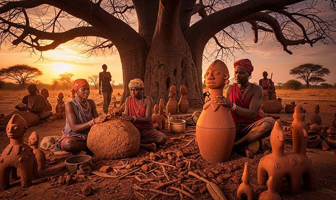 Sau Nok, din Nigeria de azi (aproximativ 1000 î.Hr. – 300 d.Hr.). Au creat sculpturi din teracotă de o expresivitate uluitoare – figuri umane cu bijuterii elaborate, cu expresii demne, uneori purtând semne ale unor boli tropicale. Cultura Nok a influențat probabil arta ulterioară din Africa de Vest, dar a dispărut misterios, lăsând în urmă doar aceste capete tăcute care ne privesc din muzee.